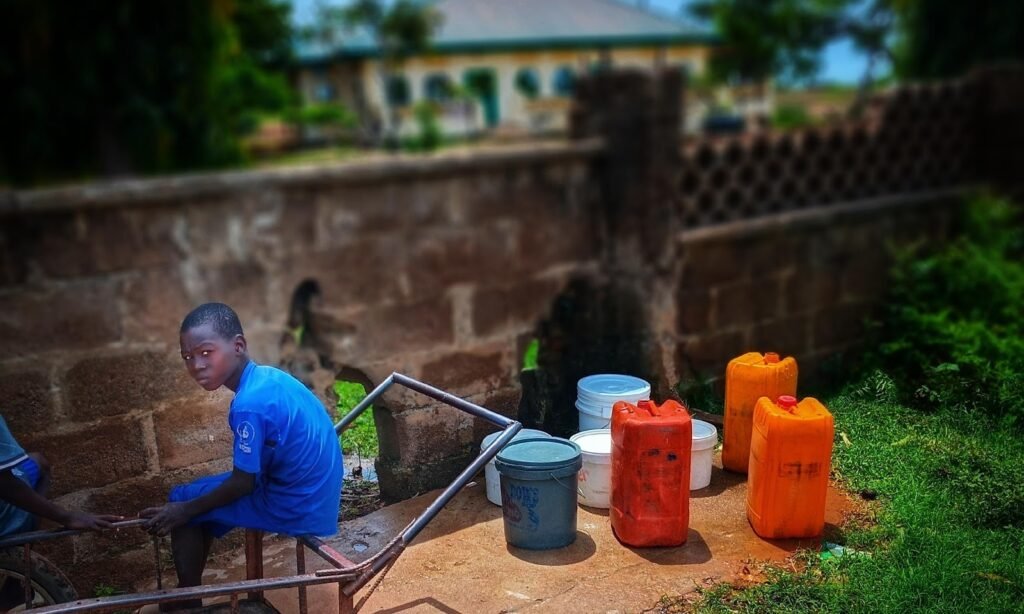 Emmanuel Sunday has been fetching water and carrying a water bowl since he was five. Every morning before school at 6 a.m., he joins the rest of his small group of children trekking miles across streets and roads, balancing jerry cans on their wheelbarrows. After school, he returns with his group for another batch.