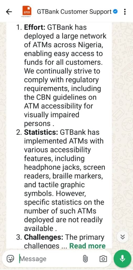 This reporter contacted GTBank Customer Support via WhatsApp to inquire, but the response was vague and a bot-generated reply that did not address the inquiry.