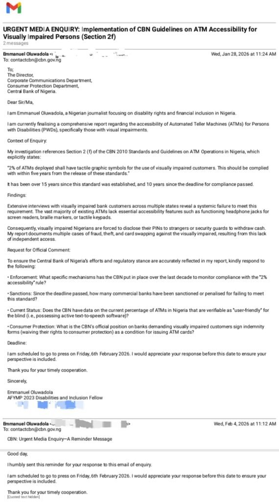 Additionally, on 28 January 2026, an email was sent to the CBN requesting details on the mechanisms it has implemented over the past decade to monitor compliance with the 2010 2 percent ATM accessibility mandate, the number of commercial banks sanctioned for failing to meet the standard operations after the compliance deadline, and the percentage of ATMs in Nigeria that are user-friendly for the visually impaired (i.e., possessing active text-to-speech software).