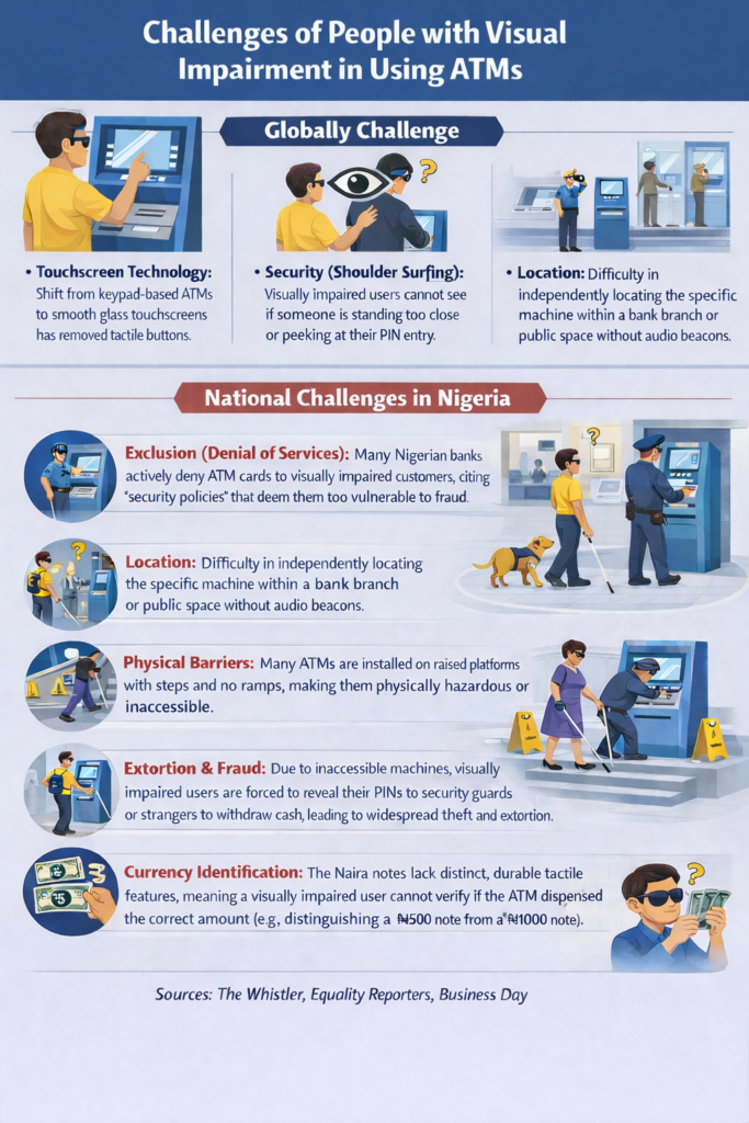 Olajumoke’s struggle highlights a massive gap in Nigeria’s push for financial inclusion. While the Central Bank of Nigeria (CBN) continues to advocate for a cashless economy, the recent surge in ATM withdrawals nationwide leaves a significant portion of the visually impaired population behind.