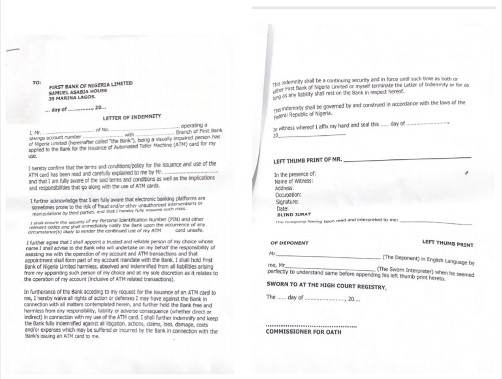 Somadina also attested to this particular challenge, stating that visually impaired customers are required to sign an indemnity form, shifting liability completely from the bank to the visually impaired person requesting the ATM card.